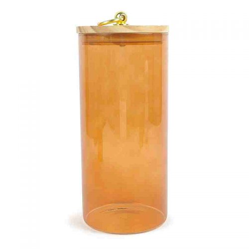 – Handmade made high borosilicate glass storage container jar with wooden lid and amber color.